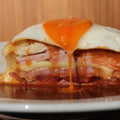 Pão de forma com bife de alcatra, linguiça, fiambre, queijo, ovo estrelado e o tradicional molho de francesinha, servida com batata frita.